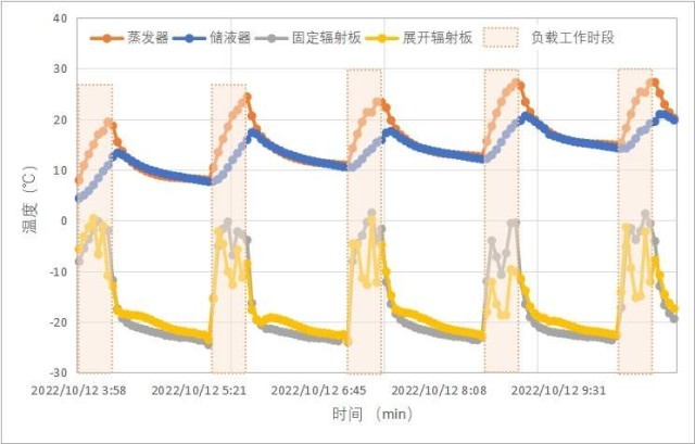 中科院微小衛(wèi)星創(chuàng)新院的可展收式輻射器成功在軌實現(xiàn)首次應(yīng)用,輻射器執(zhí)行機構(gòu)已順利完成六十余次展開和收攏動作,連續(xù)五軌動態(tài)試驗結(jié)果(如圖10)表明環(huán)路熱管-可展收式輻射器集成系統(tǒng)在負載工作時段啟動性能良好,輻射器連續(xù)展開-收攏可實現(xiàn)散熱能力在軌大范圍調(diào)控。
