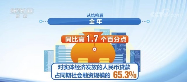 從結(jié)構(gòu)看,全年對(duì)實(shí)體經(jīng)濟(jì)發(fā)放的人民幣貸款占同期社會(huì)融資規(guī)模的65.3%,同比高1.7個(gè)百分點(diǎn)。