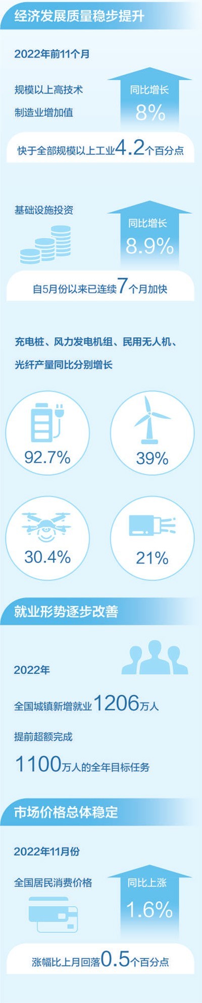 2022年,面對(duì)風(fēng)高浪急的國(guó)際環(huán)境和艱巨繁重的國(guó)內(nèi)改革發(fā)展穩(wěn)定任務(wù),我國(guó)經(jīng)濟(jì)穩(wěn)健發(fā)展,全年國(guó)內(nèi)生產(chǎn)總值預(yù)計(jì)超過(guò)120萬(wàn)億元。看供給結(jié)構(gòu),產(chǎn)業(yè)升級(jí)發(fā)展持續(xù),新動(dòng)能積蓄增強(qiáng)。2022年前11個(gè)月,規(guī)模以上高技術(shù)制造業(yè)增加值同比增長(zhǎng)8%,快于全部規(guī)模以上工業(yè)4.2個(gè)百分點(diǎn);看消費(fèi)需求,線(xiàn)上消費(fèi)需求釋放帶動(dòng)作用明顯。前11個(gè)月,全國(guó)實(shí)物商品網(wǎng)上零售額同比增長(zhǎng)6.4%,網(wǎng)絡(luò)購(gòu)物帶動(dòng)快遞等行業(yè)較快增長(zhǎng)。