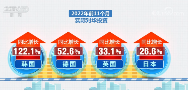 2022年前9個(gè)月,中國(guó)吸收外資規(guī)模就達(dá)到1萬(wàn)億元;前11個(gè)月,突破1.15萬(wàn)億元,超過(guò)2021年全年水平;與此同時(shí),外資來(lái)源更加多元。2022年前11個(gè)月,韓國(guó)、德國(guó)、英國(guó)、日本等國(guó)家的實(shí)際對(duì)華投資同比分別增長(zhǎng)122.1%、52.6%、33.1%和26.6%。