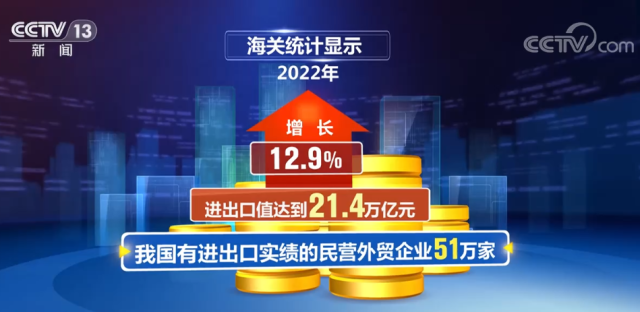 央視網(wǎng)消息:海關(guān)總署新聞發(fā)言人呂大良介紹,2022年,我國有進(jìn)出口實(shí)績的民營外貿(mào)企業(yè)51萬家,進(jìn)出口值達(dá)到21.4萬億元,進(jìn)出口規(guī)模年度占比首次超過一半,外貿(mào)“穩(wěn)定器”作用持續(xù)發(fā)揮。