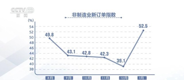 1月份中國非制造業(yè)商務(wù)活動指數(shù)為54.4%,較上月上升12.8個百分點(diǎn),結(jié)束連續(xù)6個月下降走勢;新訂單指數(shù)為52.5%,較上月上升13.4個百分點(diǎn),結(jié)束連續(xù)4個月下降走勢。非制造業(yè)供需呈現(xiàn)加速回升跡象。