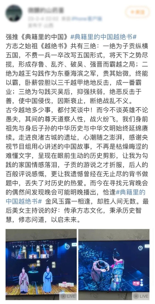 果然不負(fù)眾人所盼,第二季甫一開播,收視和好評率完美沿襲了第一季的高起點(diǎn)。而2月4日開播的《越絕書》,更是以史詩電影大片的精美和氣勢,將吳越爭霸驚心動魄的歷史經(jīng)典,精彩呈現(xiàn)于熒屏。第五期播出前后,9次登上熱搜熱榜,累計(jì)覆蓋微博用戶超2.6億人次;第二季豆瓣開分9.0,全平臺播放量近9億次,#典籍里的中國#主話題閱讀量累計(jì)達(dá)18.1億。