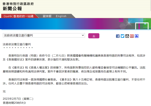 香港特區(qū)政府:堅(jiān)決反對(duì)美國會(huì)有關(guān)機(jī)構(gòu)及議員抹黑香港刑事司法程序