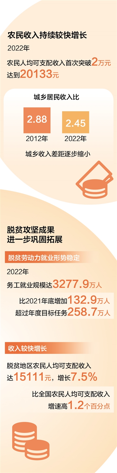 增加農(nóng)民收入是“三農(nóng)”工作的中心任務(wù)。2022年,農(nóng)民人均可支配收入首次突破2萬(wàn)元,城鄉(xiāng)居民收入比從2012年的2.88下降到2022年的2.45,城鄉(xiāng)收入差距逐步縮小。“也要看到,當(dāng)前農(nóng)民收入增速有所放緩,增收動(dòng)能有所減弱。必須高度重視,拿出長(zhǎng)短結(jié)合、務(wù)實(shí)管用的硬措施,拓寬農(nóng)民增收致富渠道?!敝醒朕r(nóng)辦專(zhuān)職副主任、農(nóng)業(yè)農(nóng)村部黨組成員吳宏耀說(shuō)。對(duì)此,今年中央一號(hào)文件在穩(wěn)定就業(yè)、經(jīng)營(yíng)增效、挖潛財(cái)產(chǎn)收入以及拓展轉(zhuǎn)移收入等方面作出相關(guān)部署,努力讓農(nóng)民腰包越來(lái)越鼓,日子越過(guò)越紅火。