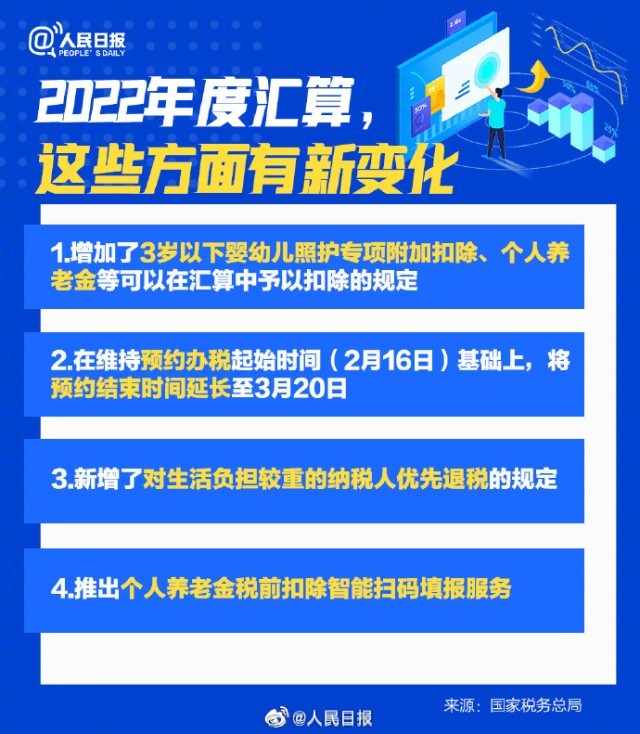 2022年度個稅匯算將于3月1日起開始,2月16日起可以提前預(yù)約辦稅。納稅人如需在3月1日至3月20日之間辦理年度匯算,可在2月16日至3月20日每天的早6點(diǎn)至晚22點(diǎn)登錄手機(jī)個人所得稅APP進(jìn)行預(yù)約。2022年度退補(bǔ)稅怎么辦理?2022年度匯算新變化又有哪些?詳戳