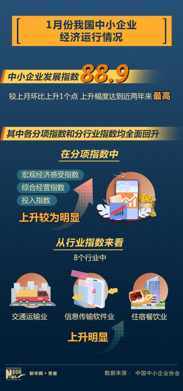 近日中國(guó)中小企業(yè)協(xié)會(huì)公布我國(guó)中小企業(yè)經(jīng)濟(jì)運(yùn)行情況。2023年1月份,中國(guó)中小企業(yè)發(fā)展指數(shù)為88.9,比去年12月回升1個(gè)點(diǎn),上升幅度達(dá)到近兩年來(lái)最高。其中,企業(yè)發(fā)展信心回升,反映企業(yè)信心狀況的宏觀經(jīng)濟(jì)感受指數(shù)為98.7,比上月上升2.1點(diǎn)。市場(chǎng)預(yù)期有所提振,市場(chǎng)指數(shù)為80.7,環(huán)比上升0.9點(diǎn)。
