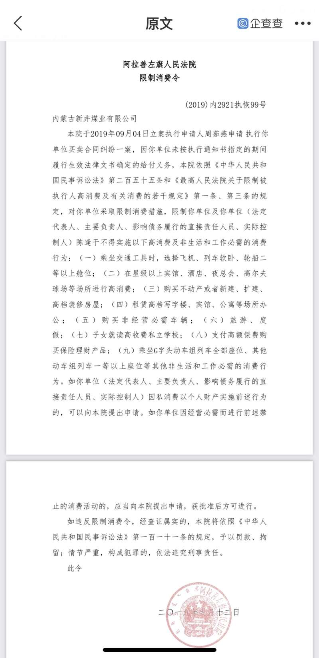 據(jù)了解,內(nèi)蒙古新井煤業(yè)有限公司于1999年登記成立,企查查平臺(tái)顯示,該公司多次涉及買賣合同糾紛、租賃合同糾紛、借款合同糾紛等,后被法院列為失信被執(zhí)行人,公司法定代表人也曾多次被法院限制高消費(fèi)。