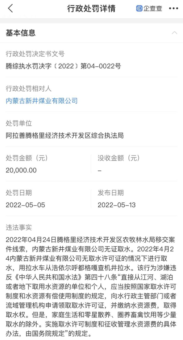 2022年該公司欠繳資源稅800多萬(wàn)元、增值稅200多萬(wàn)元,還因無取水許可證的情況下取水,被阿拉善騰格里經(jīng)濟(jì)技術(shù)開發(fā)區(qū)綜合執(zhí)法局行政處罰2萬(wàn)元。