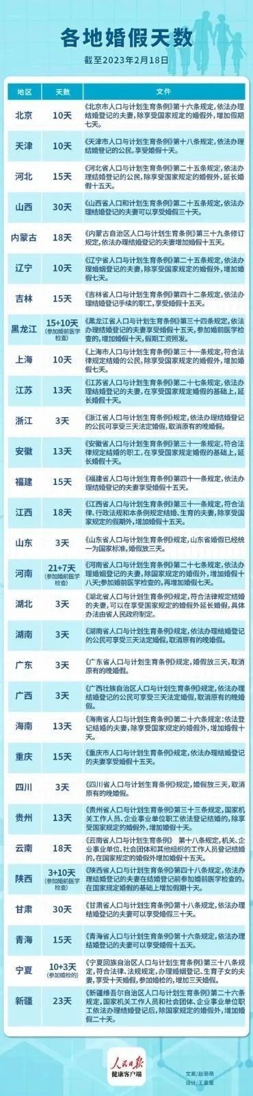 在一份全國各地婚假天數表中,具體的婚假天數,各省的差距頗大。其中,浙江等省份只有3天。