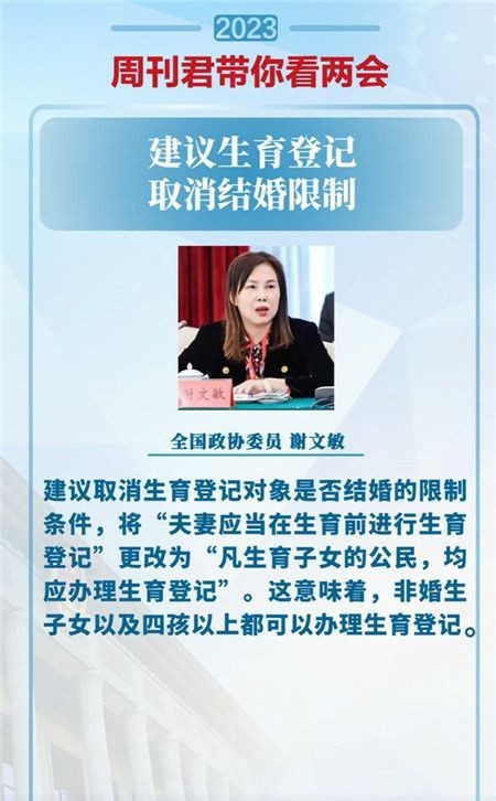 謝文敏建議,取消生育登記對象是否結(jié)婚的限制條件,將“夫妻應(yīng)當(dāng)在生育前進行生育登記”更改為“凡生育子女的公民,均應(yīng)辦理生育登記”。這意味著,非婚生子女以及四孩以上都可以辦理生育登記。