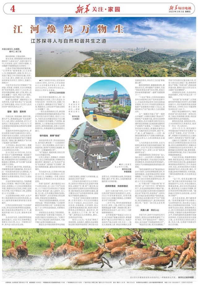 3月3日,新華每日電訊 新華關(guān)注·家園刊載題為《江河煥綺萬物生 江蘇探尋人與自然和諧共生之道》的報道。