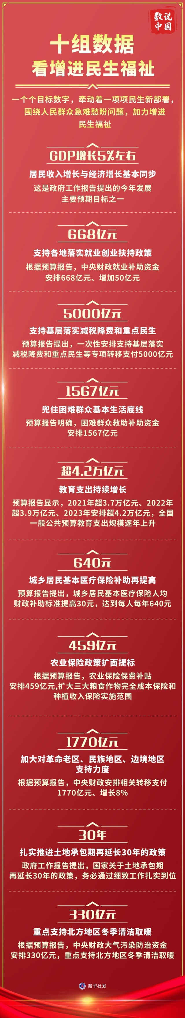 翻開5日提請(qǐng)第十四屆全國(guó)人民代表大會(huì)第一次會(huì)議審議的政府工作報(bào)告和提請(qǐng)審查的計(jì)劃報(bào)告、預(yù)算報(bào)告,一個(gè)個(gè)目標(biāo)數(shù)字,牽動(dòng)著一項(xiàng)項(xiàng)民生新部署,圍繞人民群眾急難愁盼問題,加力增進(jìn)民生福祉。