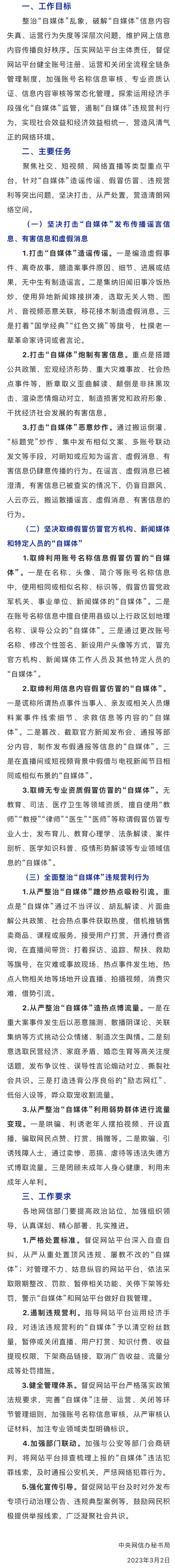 近日,中央網(wǎng)信辦印發(fā)通知,自即日起,開展為期兩個(gè)月的“清朗·從嚴(yán)整治‘自媒體’亂象”專項(xiàng)行動(dòng)。具體內(nèi)容如下: