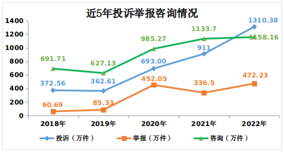 消費者積極發(fā)揮社會監(jiān)督作用,2022年全年向市場監(jiān)管部門舉報各類違法線索472.23萬件,同比增長40.34%。