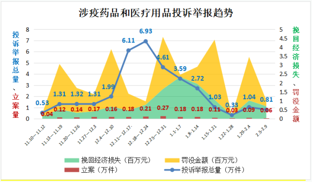“二十條”和“新十條”出臺后,疫情防控重心從防控感染轉到醫(yī)療救治,2022年11月10日至2022年底,全國12315平臺接收相關投訴舉報24.11萬件,同比增長3.88倍,環(huán)比增長2.95倍,最高峰值達到19.5倍。其中,投訴14.18萬件,舉報9.93萬件,挽回經濟損失498.17萬元。