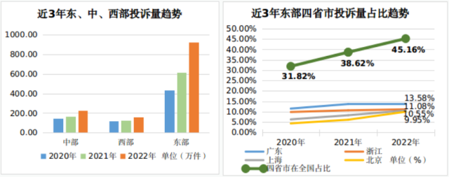 從近三年趨勢看,廣東、浙江、上海、北京4個省市的消費正在加速集聚。消費投訴數(shù)量與消費活躍水平呈正相關關系,四省市消費投訴數(shù)量在全國的占比從2020年的31.8%增長到2022年的45.16%。