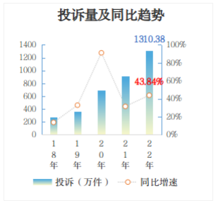 2022年,全國市場監(jiān)管部門受理消費者投訴1310.38萬件,同比增長43.84%,增速較2021年有所放大。其中,售后服務問題增長最快,群眾反映最強烈,同比增長57.67%。消費者訴求主要集中在不退款、不發(fā)貨、不履行“三包”承諾、不落實七天無理由退貨義務、送貨不及時等方面。