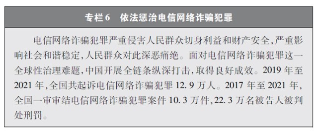 加大網(wǎng)絡(luò)犯罪懲治力度。隨著互聯(lián)網(wǎng)技術(shù)的快速發(fā)展,傳統(tǒng)犯罪加速向以互聯(lián)網(wǎng)為媒介的非接觸式犯罪轉(zhuǎn)變,電信網(wǎng)絡(luò)詐騙、網(wǎng)絡(luò)賭博、網(wǎng)絡(luò)淫穢色情等涉網(wǎng)違法犯罪多發(fā)。中國依法辦理新型網(wǎng)絡(luò)犯罪案件。連續(xù)多年開展“凈網(wǎng)行動”,嚴厲打擊群眾反映強烈的黑客攻擊破壞、侵犯公民個人信息等違法犯罪活動。持續(xù)推進“云劍”“斷卡”“斷流”“拔釘”等專項行動,打擊套路貸、校園貸、“以房養(yǎng)老”、“投資養(yǎng)老”等電信網(wǎng)絡(luò)詐騙犯罪,依法懲處為電信網(wǎng)絡(luò)詐騙犯罪團伙提供互聯(lián)網(wǎng)接入、域名注冊、服務(wù)器托管、移動互聯(lián)網(wǎng)應(yīng)用程序制作開發(fā)、網(wǎng)絡(luò)支付、引流推廣等服務(wù)支撐的黑灰產(chǎn)業(yè)。完善國家反詐大數(shù)據(jù)平臺和反詐移動互聯(lián)網(wǎng)應(yīng)用程序,建設(shè)國家涉詐黑樣本庫,完善快速止付凍結(jié)機制、涉詐資金返還機制。堅決打擊網(wǎng)絡(luò)賭博犯罪行為,從嚴治理網(wǎng)絡(luò)淫穢色情。網(wǎng)絡(luò)犯罪治理工作取得明顯成效,人民群眾安全感有效提升,社會更加和諧穩(wěn)定。