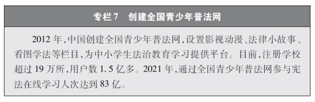 加強青少年網(wǎng)絡(luò)法治宣傳教育。青少年是祖國的未來、民族的希望。青少年網(wǎng)民在中國網(wǎng)民中的占比逐步增長。作為互聯(lián)網(wǎng)的“原住民”,青少年是網(wǎng)上學習、交流、生活最活躍的參與者、實踐者,其合法權(quán)益也更易受到網(wǎng)絡(luò)違法活動的侵害。中國從保護青少年網(wǎng)絡(luò)權(quán)益,促進青少年健康成長、全面發(fā)展出發(fā),遵循青少年身心發(fā)展規(guī)律,貼近青少年學習生活實際,聚焦網(wǎng)絡(luò)沉迷、網(wǎng)絡(luò)欺凌、網(wǎng)絡(luò)淫穢色情信息等重點問題,通過普法微綜藝、兒童普法話劇、網(wǎng)絡(luò)普法故事廣播、網(wǎng)絡(luò)普法云課堂、學法用法知識競賽、法治副校長進校園、編寫網(wǎng)絡(luò)普法讀本等生動活潑、豐富多彩的形式開展法治宣傳教育,逐步形成了政府、社會、學校、家庭相結(jié)合的法治宣傳教育格局,為提升青少年網(wǎng)民法治意識和網(wǎng)絡(luò)安全素養(yǎng)提供了全面保障。