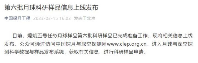 央視網(wǎng)消息:據(jù)“中國(guó)探月工程”微信公眾號(hào)消息,目前,嫦娥五號(hào)任務(wù)月球樣品第六批科研樣品已完成準(zhǔn)備工作,現(xiàn)將相關(guān)信息上線發(fā)布。公眾可通過(guò)訪問(wèn)中國(guó)探月與深空探測(cè)網(wǎng)www.clep.org.cn,進(jìn)入月球與深空探測(cè)科學(xué)數(shù)據(jù)與樣品發(fā)布系統(tǒng),獲取有關(guān)信息,進(jìn)行科研樣品申請(qǐng)。