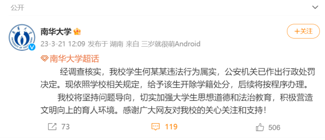 央視網(wǎng)消息:據(jù)@南華大學(xué) 微博最新消息,經(jīng)調(diào)查核實(shí),該校學(xué)生何某某違法行為屬實(shí),公安機(jī)關(guān)已作出行政處罰決定?,F(xiàn)依照學(xué)校相關(guān)規(guī)定,給予該生開(kāi)除學(xué)籍處分,后續(xù)將按程序辦理。
