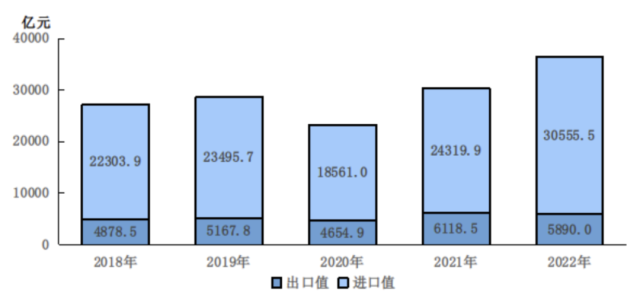 圖6 2018-2022年進(jìn)口和出口總值