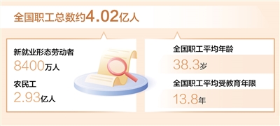 本報(bào)北京3月26日電 (記者易舒冉)記者日前從中華全國(guó)總工會(huì)獲悉:第九次全國(guó)職工隊(duì)伍狀況調(diào)查已于近期結(jié)束,調(diào)查表明,目前全國(guó)職工總數(shù)4.02億人左右,新就業(yè)形態(tài)勞動(dòng)者8400萬(wàn)人,農(nóng)民工2.93億人;職工平均年齡38.3歲、平均受教育年限13.8年。調(diào)查還顯示,職工理想信念更加堅(jiān)定,主人翁地位持續(xù)鞏固,越來(lái)越多的職工積極投身“當(dāng)好主人翁、建功新時(shí)代”“建功‘十四五’、奮進(jìn)新征程”等主題勞動(dòng)和技能競(jìng)賽。
