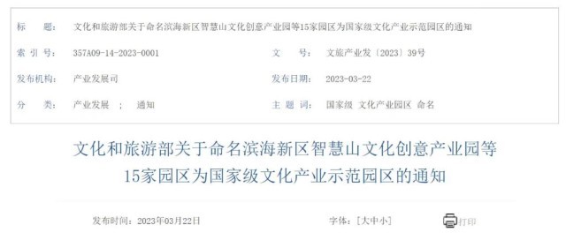 根據(jù)文化和旅游部關(guān)于命名濱海新區(qū)智慧山文化創(chuàng)意產(chǎn)業(yè)園等15家園區(qū)為國(guó)家級(jí)文化產(chǎn)業(yè)示范園區(qū)的通知,此次新獲命名的園區(qū)包括天津市濱海新區(qū)智慧山文化創(chuàng)意產(chǎn)業(yè)園、河北省中國(guó)曲陽雕塑文化產(chǎn)業(yè)園、江蘇省南京秦淮特色文化產(chǎn)業(yè)園、浙江省衢州儒學(xué)文化產(chǎn)業(yè)園、湖南省馬欄山視頻文創(chuàng)產(chǎn)業(yè)園、西藏自治區(qū)西藏文化旅游創(chuàng)意園區(qū)等。