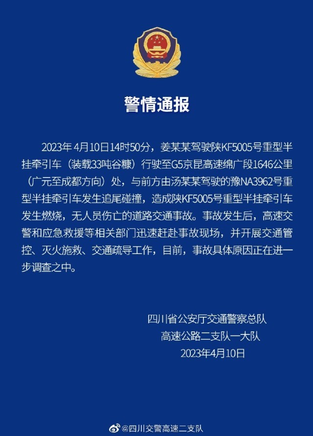 央視網(wǎng)消息:據(jù)@四川交警高速二支隊(duì)微博通報,4月10日14時50分,姜某某駕駛陜KF5005號重型半掛牽引車(裝載33噸谷糠)行駛至G5京昆高速綿廣段1646公里(廣元至成都方向)處,與前方由湯某某駕駛的豫NA3962號重型半掛牽引車發(fā)生追尾碰撞,造成陜KF5005號重型半掛牽引車發(fā)生燃燒,無人員傷亡的道路交通事故。事故發(fā)生后,高速交警和應(yīng)急救援等相關(guān)部門迅速趕赴事故現(xiàn)場,并開展交通管控、滅火施救、交通疏導(dǎo)工作,目前,事故具體原因正在進(jìn)一步調(diào)查之中。