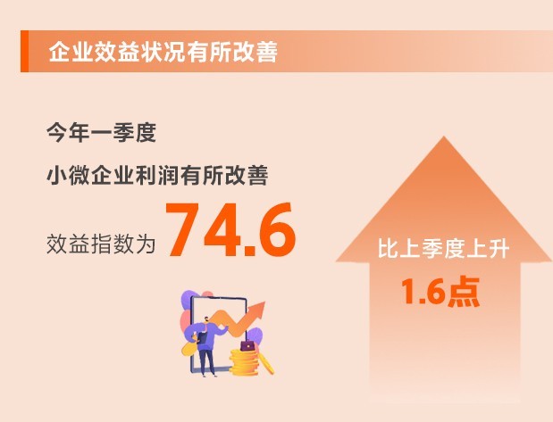 企業(yè)生產(chǎn)經(jīng)營加速恢復(fù),原材料價格漲幅收窄,以及延續(xù)優(yōu)化減稅降費政策減輕企業(yè)負擔(dān),小微企業(yè)利潤有所改善。一季度,效益指數(shù)為74.6,比上季度上升1.6點,反彈幅度較大,但仍處于歷史較低位。所調(diào)查的8個行業(yè)效益指數(shù)均有所上升。