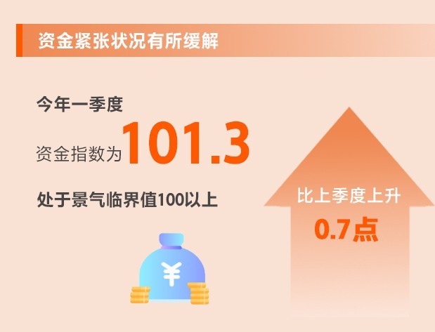 央行降準以及指導(dǎo)金融機構(gòu)繼續(xù)支持小微企業(yè),多措并舉“精準滴灌”,小微企業(yè)融資狀況不斷改善。一季度,資金指數(shù)為101.3,比上季度上升0.7點,處于景氣臨界值100以上。其中,流動資金指數(shù)為86.3,比上季度上升1.1點;融資指數(shù)為90.8,環(huán)比上升0.5點。所調(diào)查的8個行業(yè)中,8個行業(yè)流動資金指數(shù)、6個行業(yè)融資指數(shù)均上升。