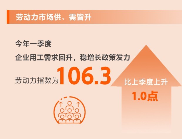 隨著生產(chǎn)生活秩序的恢復(fù),人員流動性的提高,企業(yè)用工需求開始回升,同時穩(wěn)增長政策持續(xù)發(fā)力,從業(yè)人數(shù)有所上升。一季度,勞動力指數(shù)為106.3,比上季度上升1.0點。其中,供應(yīng)指數(shù)為113.6,比上季度上升0.1點;需求指數(shù)為98.9,比上季度上升1.9點。