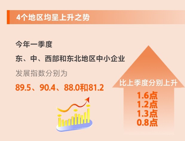 一季度,東、中、西部和東北地區(qū)中小企業(yè)發(fā)展指數(shù)分別為89.5、90.4、88.0和81.2,比上季度分別上升1.6、1.2、1.3和0.8點,東部地區(qū)指數(shù)上升幅度最大,中部地區(qū)指數(shù)最高,說明東部和中部地區(qū)經(jīng)濟和中小微企業(yè)恢復(fù)較快。