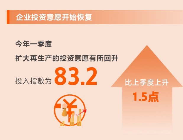 各地投向基礎(chǔ)領(lǐng)域、短板領(lǐng)域、科技創(chuàng)新領(lǐng)域的項目和計劃增多,企業(yè)對未來的信心有所增強,擴大再生產(chǎn)的投資意愿有所回升。一季度,投入指數(shù)為83.2,比上季度上升1.5點,所調(diào)查的8個行業(yè)投入指數(shù)均上升。