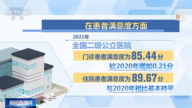 在患者滿意度方面,2021年,全國二級(jí)公立醫(yī)院門診患者滿意度為85.44分,較2020年增加0.21分,住院患者滿意度為89.67分,與2020年相比基本持平。