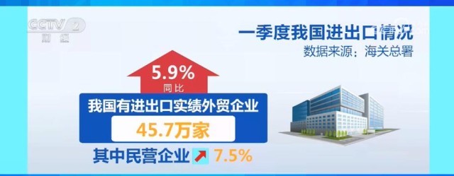 一季度,我國貨物進(jìn)出口總額98877億元。其中,出口56484億元,同比增長8.4%,保持了較快增長,特別是我國對(duì)“一帶一路”沿線國家進(jìn)出口增長16.8%,對(duì)RCEP其他成員國的進(jìn)出口增長7.3%。同時(shí),我國外貿(mào)競爭新優(yōu)勢、增長新動(dòng)能不斷培育壯大。一季度電動(dòng)載人汽車、鋰電池、太陽能電池出口同比分別增長122.3%、94.3%和23.6%,合計(jì)增長66.9%,同比增量超過1000億元,拉高了出口整體增速2個(gè)百分點(diǎn)。此外,一季度,我國有進(jìn)出口實(shí)績外貿(mào)企業(yè)45.7萬家,同比增長5.9%。其中,民營企業(yè)增加7.5%,外貿(mào)經(jīng)營主體數(shù)量穩(wěn)中有增,顯示外貿(mào)“熱度”穩(wěn)步提升。