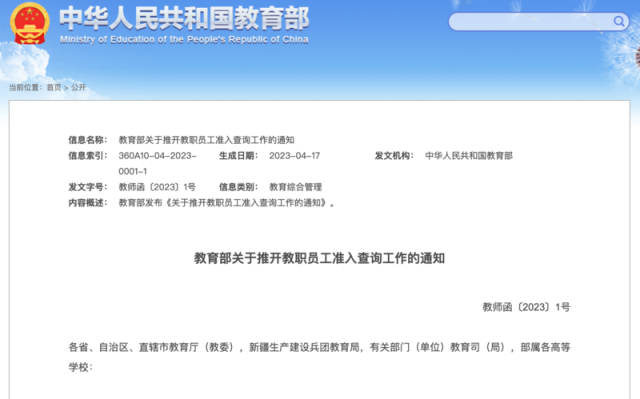 教育部部署教職員工準(zhǔn)入查詢制度:對(duì)師德違規(guī)問題“零容忍”