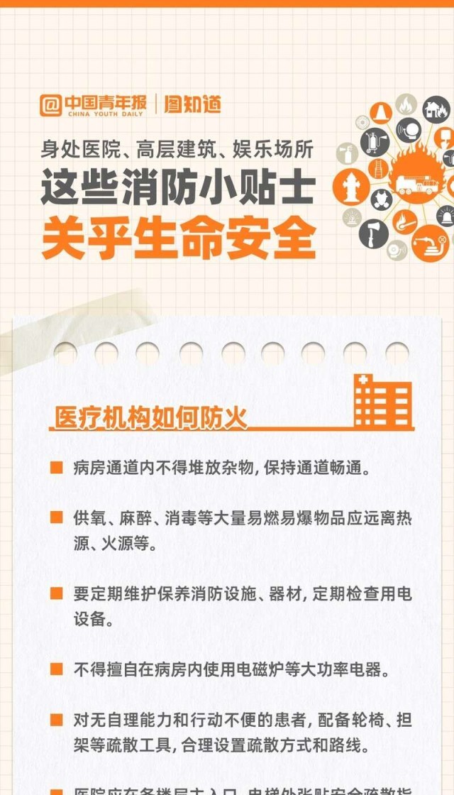 當(dāng)你走進(jìn)KTV、高層寫字樓、醫(yī)院等人員密集場所時,是否留心觀察過消防通道的位置?日常經(jīng)過的住宅樓道內(nèi)是否張貼了消防要求?生命安全無小事,著眼細(xì)處才能防患于未“燃”。這里有一份火災(zāi)高風(fēng)險區(qū)域場所的消防小貼士,請查收~