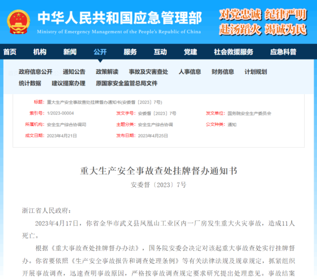 2023年4月17日,你省金華市武義縣鳳凰山工業(yè)區(qū)內一廠房發(fā)生重大火災事故,造成11人死亡。
