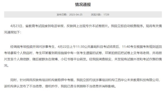 經(jīng)調(diào)閱考場(chǎng)視頻并詢問(wèn)涉事考生,4月22日上午11:30公共基礎(chǔ)科目考試結(jié)束后,11:40考生根據(jù)考務(wù)規(guī)則返回考場(chǎng)拿取個(gè)人物品時(shí),考生鄧某看到前排抽屜中有一張考生遺留的試卷,鄧某拍照后把試卷上交考場(chǎng)老師,并將照片發(fā)至個(gè)人微信群,隨后被群友在微博、小紅書(shū)等平臺(tái)轉(zhuǎn)發(fā)。經(jīng)江西省教育考試院調(diào)查核實(shí),未發(fā)現(xiàn)有試題外泄和考試作弊的情況。