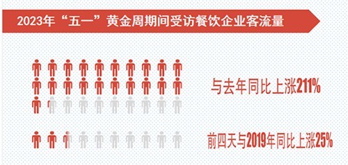 “五一”黃金周期間,受訪餐飲企業(yè)營業(yè)收入比去年同期上漲149%,客流量同比去年上漲211%;今年“五一”前四天營業(yè)收入比2019年“五一”上漲26%,客流量比2019年“五一”上漲25%。
