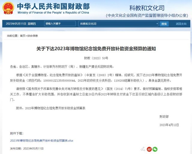 財政部:2023年博物館紀念館免費開放補助資金預(yù)算下達