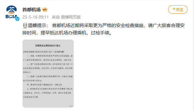 央視網(wǎng)消息:5月16日,@首都機(jī)場(chǎng) 官方微博發(fā)布提示:首都機(jī)場(chǎng)近期將采取更為嚴(yán)格的安全檢查措施,請(qǐng)廣大旅客合理安排時(shí)間,提早抵達(dá)機(jī)場(chǎng)辦理乘機(jī)、過(guò)檢手續(xù)。