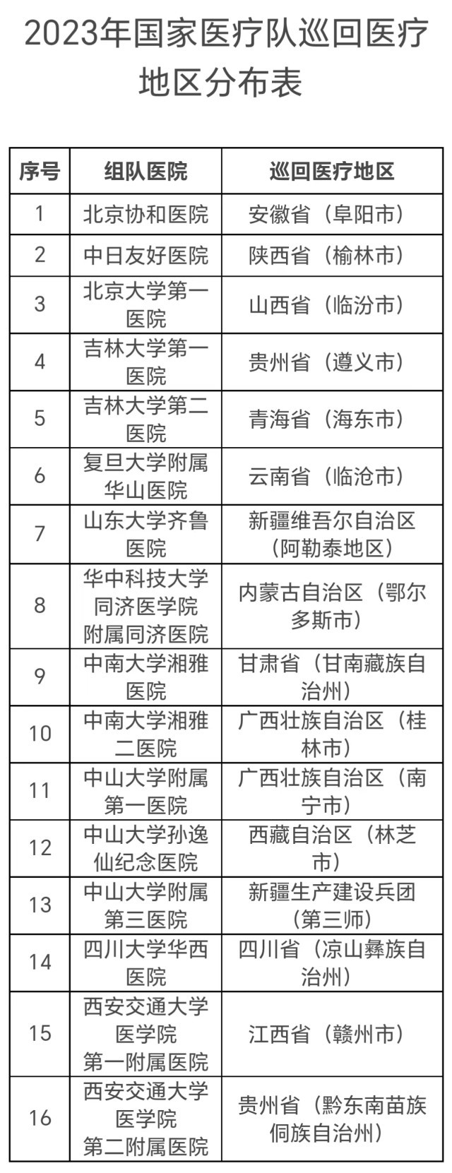 國家醫(yī)療隊的組隊醫(yī)院包括北京協(xié)和醫(yī)院、中日友好醫(yī)院等16家,分赴安徽、陜西等地,派出時間為6—10月。每支國家醫(yī)療隊不少于5人,以副高及以上職稱的醫(yī)務(wù)人員為主,重點開展巡回醫(yī)療、技術(shù)和管理指導(dǎo)、人員培訓(xùn)、加強遠(yuǎn)程醫(yī)療協(xié)作網(wǎng)建設(shè)等工作。工作時間不少于3周,其中在縣域開展工作的時間不少于兩周。