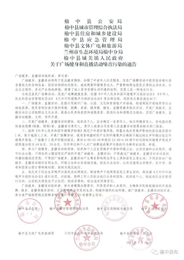日前,蘭州市榆中縣公安局、榆中縣城市管理綜合執(zhí)法局等單位聯(lián)合發(fā)布《關(guān)于廣場健身和直播活動噪音污染的通告》(以下簡稱《通告》),其中明確,當?shù)貜V場健身、直播活動組織者參與者嚴格按照規(guī)定控制音響音量,于每天21時前停止活動。