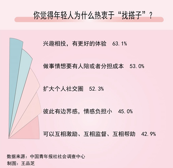 近日,中國青年報(bào)社社會(huì)調(diào)查中心聯(lián)合問卷網(wǎng)(wenjuan.com),對(duì)1335名受訪者進(jìn)行的一項(xiàng)調(diào)查顯示,63.1%的受訪青年認(rèn)為找“搭子”是因?yàn)榕d趣相投,有更好的體驗(yàn),53.0%的青年覺得是因?yàn)樽鍪虑橄胍腥伺慊蛘叻謸?dān)成本。