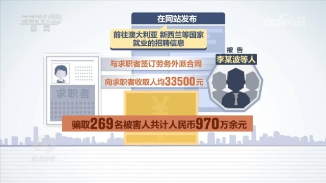 2023年5月,北京市房山區(qū)法院也判決了一起出國(guó)勞務(wù)詐騙案,被告李某波因詐騙罪一審判決13年6個(gè)月有期徒刑。判決書顯示:被告李某波等人冒用北京一家勞務(wù)派遣有限公司名義開展業(yè)務(wù),在網(wǎng)站發(fā)布前往澳大利亞、新西蘭等國(guó)家就業(yè)的招聘信息,與求職者簽訂勞務(wù)外派合同,向求職者收取人均33500元的費(fèi)用,最終騙取269名被害人共計(jì)人民幣970萬余元。檢察官還總結(jié)了這類詐騙案的幾個(gè)特點(diǎn)。