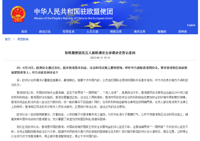 問:6月15日,歐洲議會通過決議,批評香港基本自由、法治和司法獨立遭到侵蝕,呼吁中方廢除香港國安法,要求香港特區(qū)政府釋放黎智英等人。中方對此有何評論?