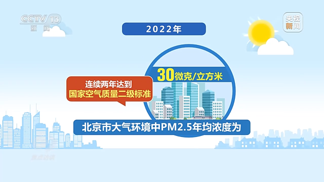 黨的十八大以來(lái),北京市堅(jiān)決打好污染防治攻堅(jiān)戰(zhàn),大力壓減燃煤、治理機(jī)動(dòng)車(chē)排放、揮發(fā)性有機(jī)物以及各類(lèi)揚(yáng)塵污染,實(shí)施“一微克”行動(dòng),治理成效顯著,藍(lán)天越來(lái)越多。監(jiān)測(cè)結(jié)果顯示,2022年,北京市大氣環(huán)境中PM2.5年均濃度為每立方米30微克,比2013年下降了66.5%,連續(xù)兩年達(dá)到國(guó)家空氣質(zhì)量二級(jí)標(biāo)準(zhǔn)。重污染天數(shù)由2013年的58天減少到2022年的3天,“北京藍(lán)”成為常態(tài)。